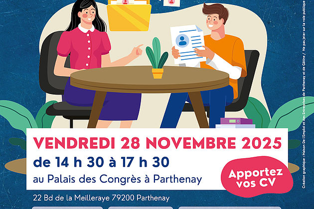 Le28nov.EmploiRecrut'day en GâtineDu 14:30 à 17:30 Palais des congrès 22 boulevard de la Meilleraye 79200 Parthenay