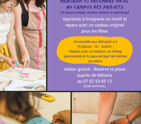 Atelier linogravure sur Totebag et autres textiles, animés par Lucie Martineau, possibilité d'apporter d'autres textiles (vêtements, sacs, etc) pour les personnaliser.
