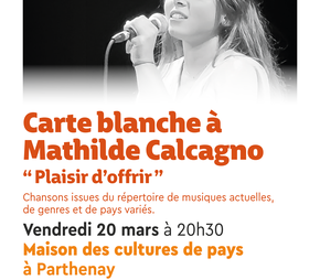 Mathilde Calcagno interprète des chansons issues du répertoire de musiques actuelles, de genres et de pays variés.
