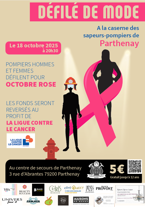 L'amicale et les pompiers de Parthenay font leur come-back pour une deuxième édition du défilé de mode pour Octobre rose le samedi 18 octobre 2025 à 20 heures 30 à la caserne des sapeurs pompiers de Parthenay.