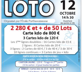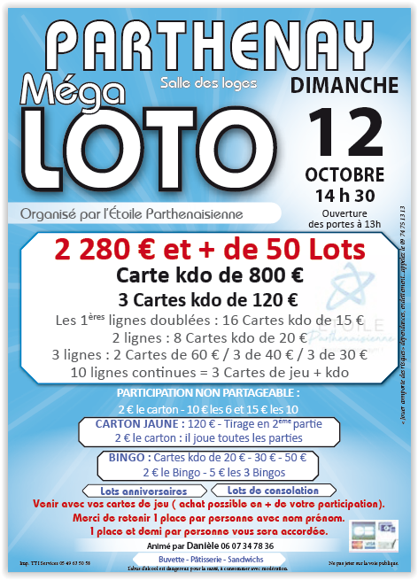 AccueilAgendaMéga loto de l'Étoile parthenaisienne Imprimer/Exporter cette page Exporter la page au format PDFPartager cette page par e-mailPartager surFacebookTwitterLinkedInLe12oct.à 14h30 Domaine des loges 28 Rue du Président Salvador Allende 79200 ParthenayJeuMéga loto de l'Étoile parthenaisienne Ajouter à mon calendrier Plus de 2 280 euros de lots,contact 06 07 34 78 36Sélection de la vue© OpenStreetMap contributorsFermerPrécédentRetour à la listeSuivant