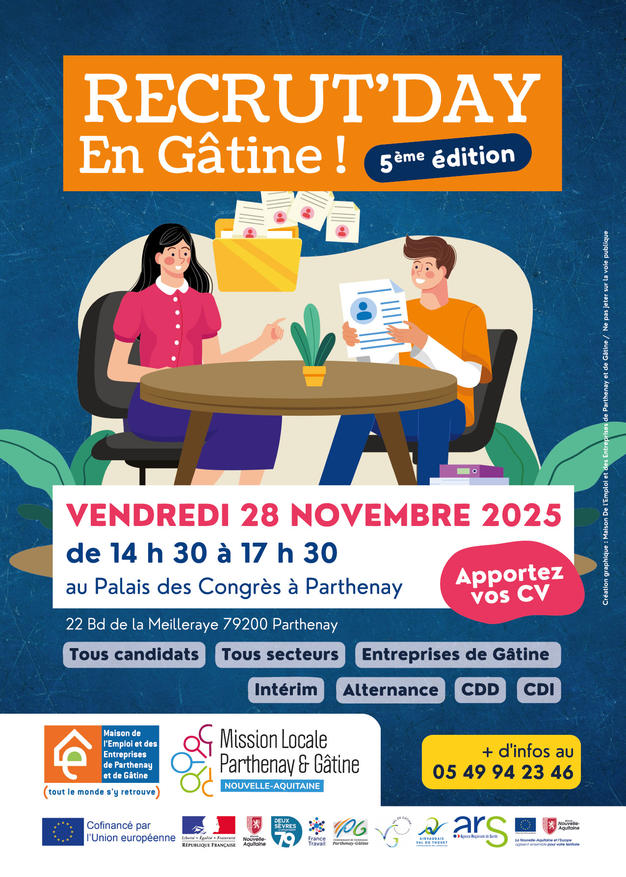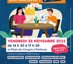 L’équipe de la Maison de l’Emploi et des Entreprises de Parthenay et de Gâtine vous attend le vendredi 28 novembre de 14h30 à 17h30 au Palais des Congrès à Parthenay.