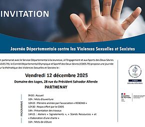 En partenariat avec le Service Départemental à la Jeunesse, à l’Engagement et aux Sports des Deux-Sèvres (SDJES 79), le Comité Départemental Olympique et Sportif des Deux-Sèvres (CDOS 79) vous convie le vendredi 12 décembre 2025 de 9h30 à 16h au Domaine des Loges de Parthenay pour évoquer sur le sujet des violences sexuelles et sexistes concernant spécifiquement les champs de la jeunesse et du mouvement sportif,