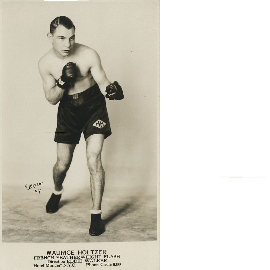 Il s’agit de Maurice HOLTZER (1906-1989), champion d’Europe et IBU poids plumes en 1936-1938. Dans son café place du Champ de foire (actuelle place du 8 mai) qu’il a tenu à partir de 1944, il exposait reliques et photos de sa carrière professionnelle. Il s’investit également dans la vie sportive locale. Une section de boxe était apparue au sein du Racing Club pendant la guerre. Les 9 février et 13 avril 1944 la ville accueille ainsi deux importants galas de boxe avec notamment un match exhibition entre Maurice HOLTZER et Marcel THIL (1904-1964), ancien champion du monde poids moyens. Parmi les boxeurs parthenaisiens d’alors, un certain Victor HAMARD qui sera le grand animateur de la gymnastique après-guerre : il fut champion de boxe des Deux-Sèvres et finaliste du championnat du Poitou à Rochefort en décembre 1943, catégorie poids-mouches.