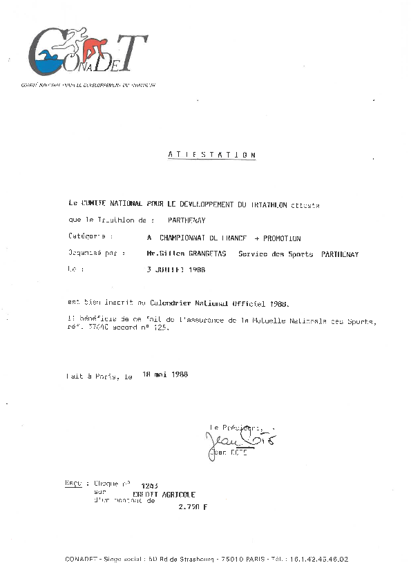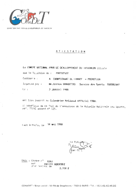 Faisant partie des sports dits « californiens » (le premier triathlon moderne apparaît à San Diego en 1974) qui se diffusent en France à cette époque, le triathlon associe la compétition athlétique en plein air avec un esprit de compétition assez libre et une volonté de performance en lien avec la technologie (évolution des vélos, apparition de tenues tri-fonctions…). L’implantation du triathlon à Parthenay est assez précoce puisque les premières épreuves amateurs ne sont organisées en France que depuis 1983 et le CONADET qui préfigure la Fédération française de triathlon a été créé en 1985.
