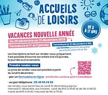 AccueilPublicationsAccueil de loisirs : programme des prochaines vacances Imprimer/Exporter cette page Exporter la page au format PDFPartager cette page par e-mailPartager surFacebookTwitterLinkedInPratiqueAccueil de loisirs : programme des prochaines vacances1 documentPublié le 03 décembre 2025 Pour les 3-5 ans, 6-8 ans ou 9-17 ans, des animations et sorties adaptées sont proposées. Dépliant des prochaines vacances.pdf (1,3 Mo) Télécharger Feuilleter PrécédentRetour à la listeSuivant