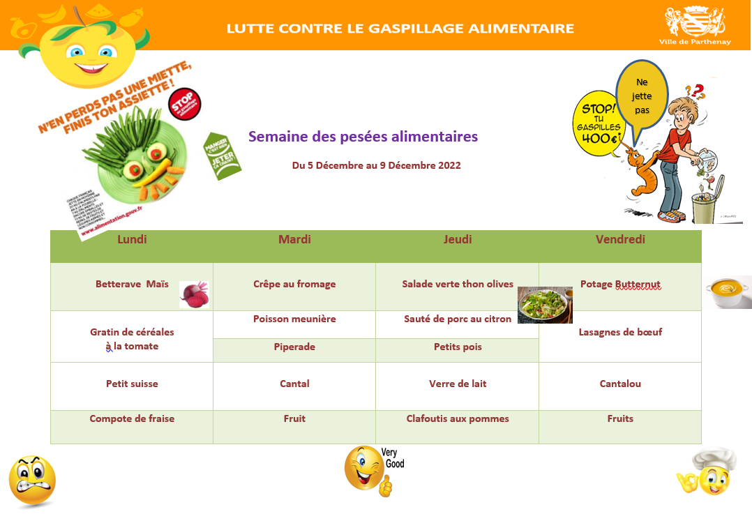 - Fin février 2023 (du 20 au 24) : nouvelle pesée des déchets, sur la base des mêmes menus présentés en décembre 2022 pour comparer. Bonne nouvelle : le gaspillage alimentaire est en baisse ! Voir détail ci-dessous